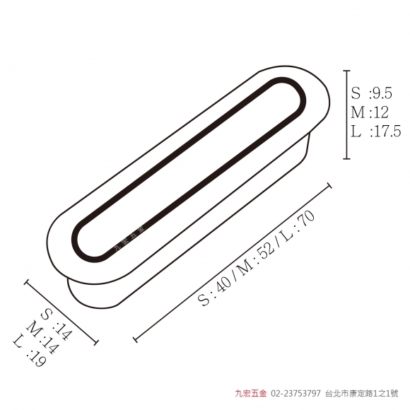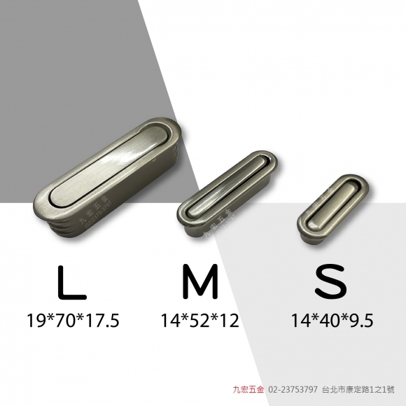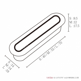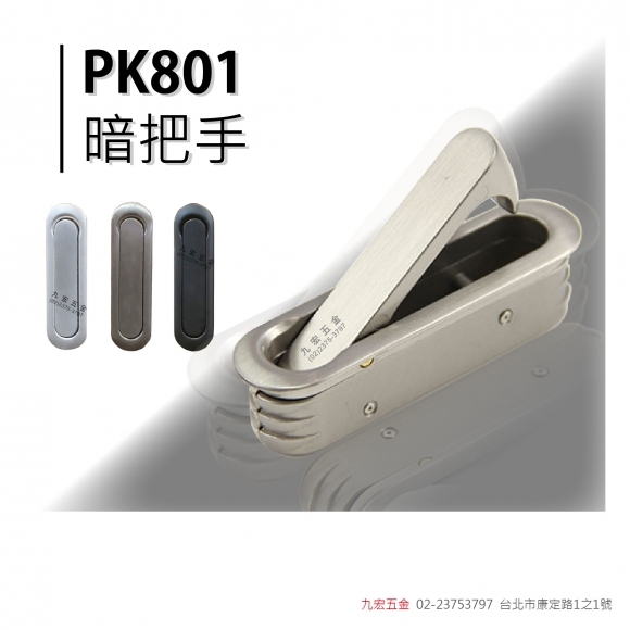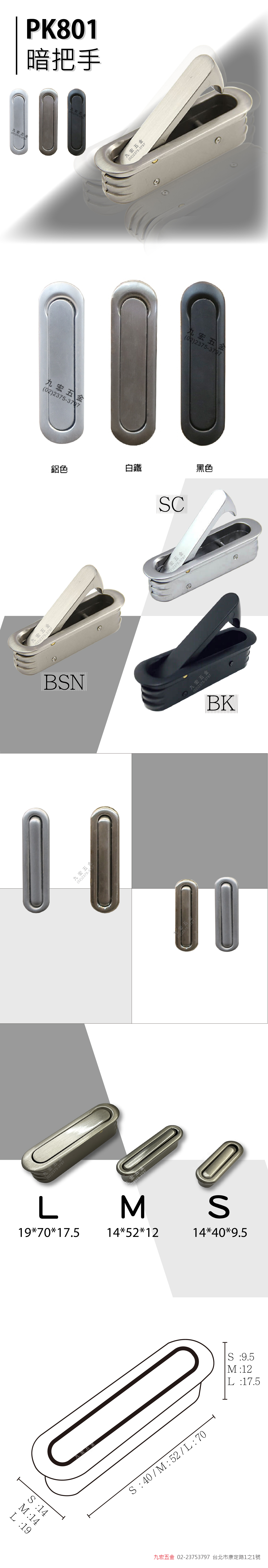 產品說明 品名 包外尺寸 開孔尺寸 顏色 PK801 - L W19*L70*D17.5 mm W15*L65*D16 mm 鋁本色、白鐵色、黑 PK801 - M W14*L52*D12 mm W10*L47*D11 mm 鋁本色、白鐵色 PK801 - S W14*L40*D9.5 mm W10*L35.5*D8 mm 鋁本色、白鐵色 材質 鋅合金 #PK801暗把手 #暗把手 #PK801-S #PK801-M #PK801-L