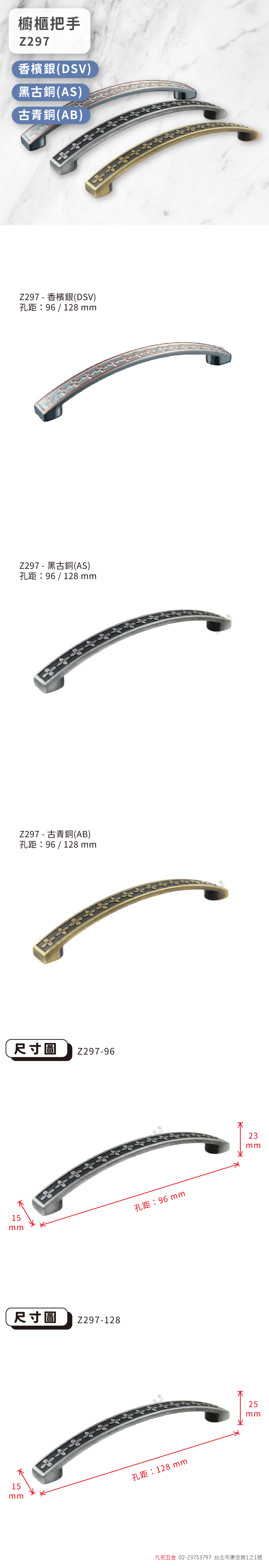 產品介紹 以經典優雅的曲線結構與古典紋飾為亮點,兼具復古與實用設計。 細膩的紋路壓花搭配三款經典色系,無論搭配實木櫥櫃、仿舊風格家具,或現代混搭空間皆相得益彰。 提供兩種孔距,滿足不同尺寸與應用場景,適用於廚櫃、衣櫃、鞋櫃、玄關門等多元空間。 採用鋅合金材質製作,表面經耐磨處理,握感紮實,細節講究,是高質感家具五金的理想選擇。 產品說明 品名 Z297 櫥櫃把手 規格 孔距 包外尺寸 96 mm 96 mm L115*W15*H23 mm 128 mm 128 mm L160*W15*H25 mm 材質 鋅 顏色 香檳銀 黑古銅 古青銅 #Z297 #櫃體把手 #櫥櫃把手 #抽屜把手 #系統櫃把手 #家具五金 #鋅合金把手 #簡約設計 #時尚把手 #多色可選 #質感把手 #門把 #五金配件