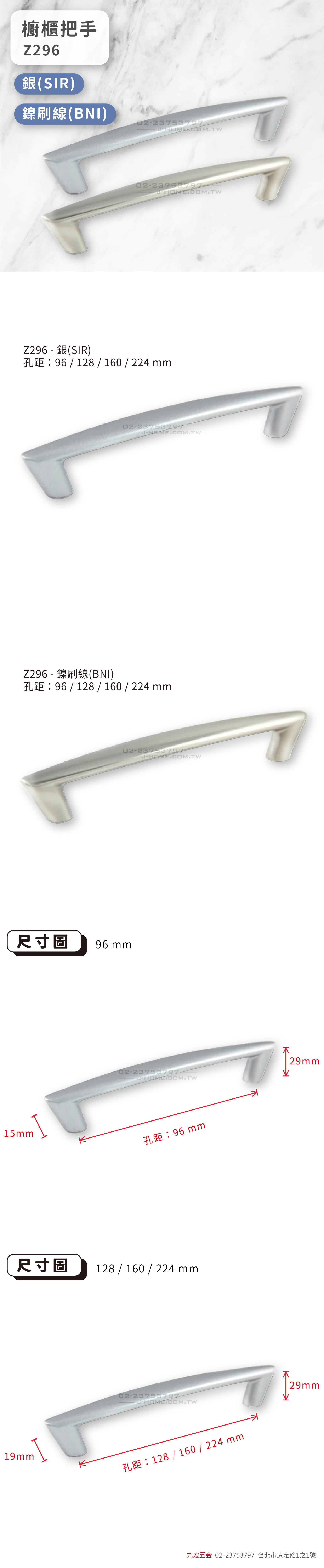產品介紹 提供兩種現代質感表面,輕鬆融入各式居家風格,為空間增添極簡美學。 擁有多種孔距選擇,能靈活適應各種尺寸的櫃體與抽屜,滿足不同家具需求。 簡潔筆直的線條與圓潤邊角設計,不僅外型時尚大方,更提供舒適穩固的握持手感,確保日常使用的便利性。 產品規格 品名 Z296 櫥櫃把手 規格 孔距 包外尺寸 96 mm 96 mm L125*W15*H29 mm 128 mm 128 mm L160*W19*H29 mm 160 mm 160 mm L185*W19*H29 mm 224 mm 224 mm L250*W19*H29 mm 材質 鋅 顏色 銀色 鎳刷線 備註 全尺寸庫存不多**售完停產** 96 mm僅剩銀色 #Z296 #櫥櫃把手 #櫃門把手 #抽屜把手 #把手 #家具把手 #現代把手 #簡約把手 #極簡把手 #北歐把手 #直線把手 #居家裝潢 #家具改造 #櫥櫃五金 #門把 #櫃子把手 #抽屜拉手 #質感生活