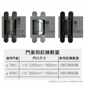 可根據門片尺寸、重量,配合使用鉸鍊數量