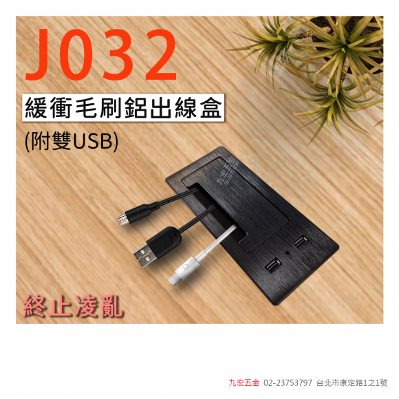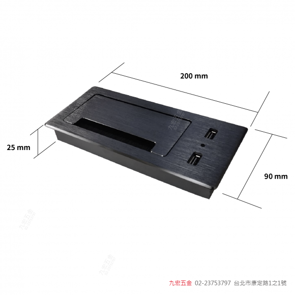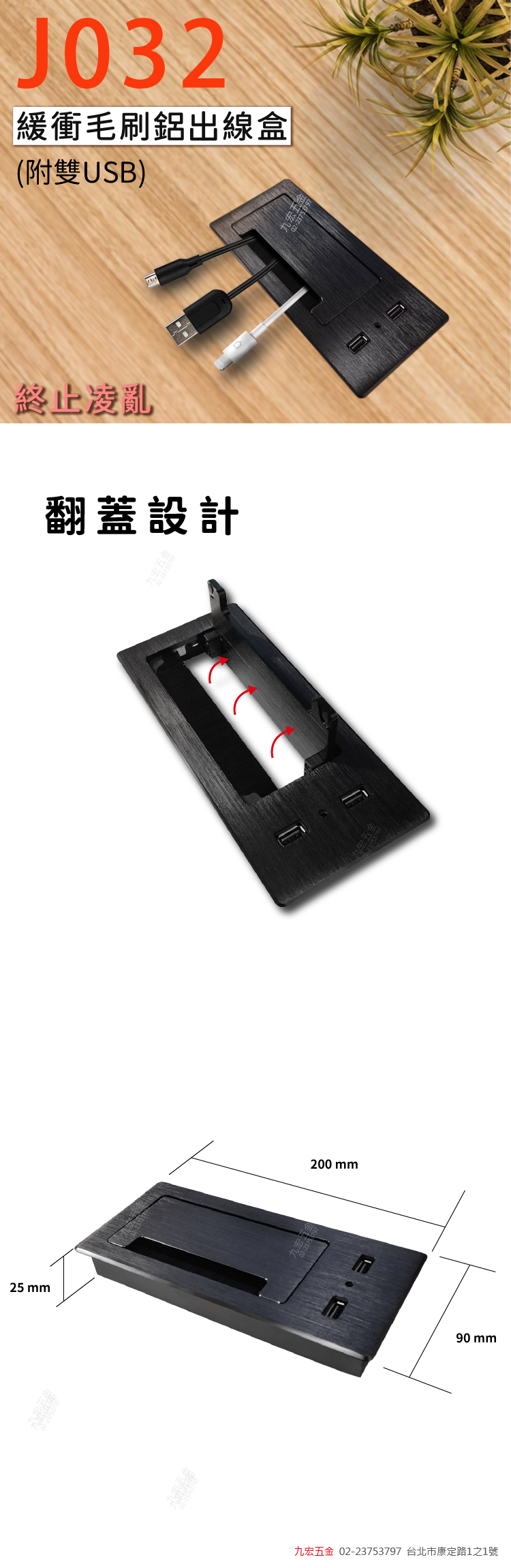 產品特色 終止桌面凌亂、翻蓋設計、好收納 毛刷密集及防塵耐用 產品規格 品名 J032-200 緩衝毛線刷鋁出線盒(附雙USB) 包外尺寸 W200*D90*H25 mm 開孔尺寸 W130*D61*H20 mm 材質 鋁合金 顏色 黑色 #J032緩衝毛線刷鋁出線盒 #緩衝毛線刷鋁出線盒 #J032