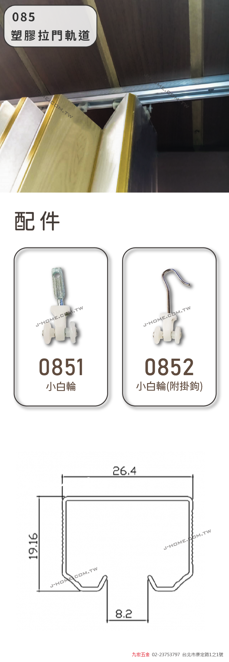 產品特色 輕巧耐用,安裝方便,滑動順暢不卡頓。 材質防潮防鏽,適合浴室、陽台等潮濕空間使用。 靜音設計,有效降低開關聲響,提升生活舒適度。 產品規格 品名 085塑膠拉門軌道 尺寸 W26.4*H19.16 材質 鋁合金 顏色 霧光 配件(加購) 0851 小白輪 0852 小白輪(附掛鉤) #085塑膠拉門軌道#085#塑膠拉門軌道#塑膠#拉門#軌道
