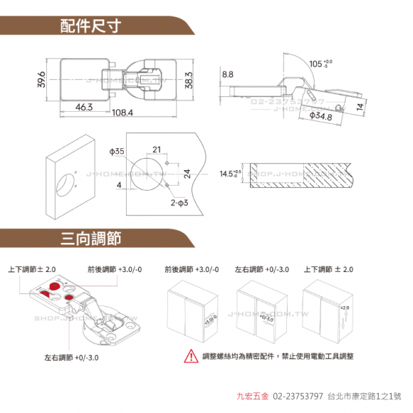 ■ 三向調整:上下(±2mm)、左右(+0mm / -3mm)、前後(+3mm / -0mm)