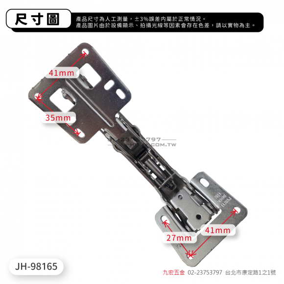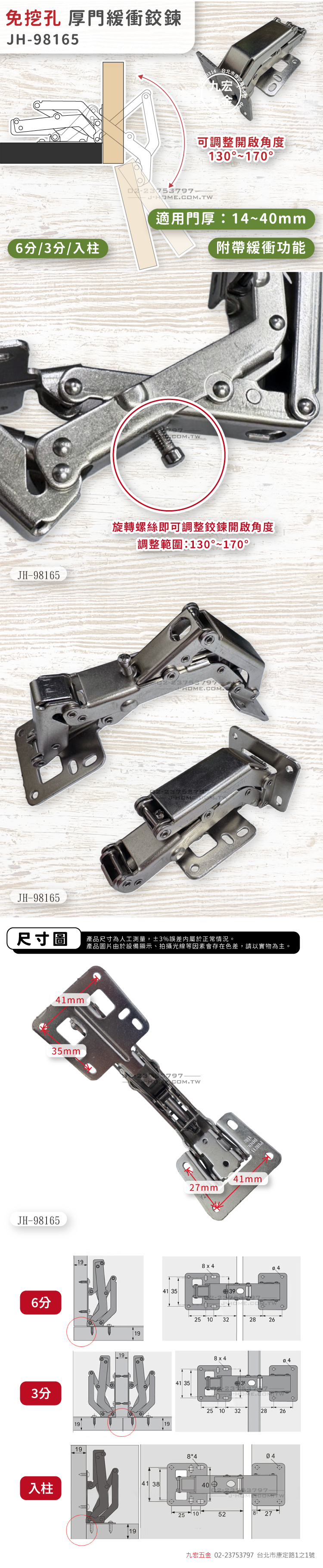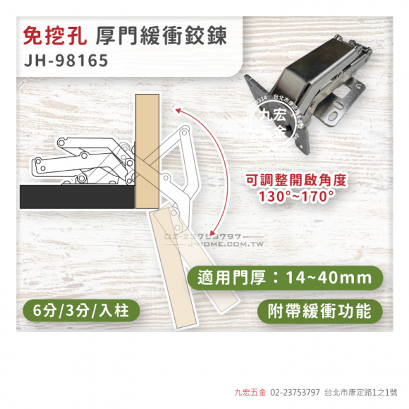 產品介紹 專為厚門板設計的免挖孔鉸鍊,安裝簡單,不需挖孔即可牢固固定。 具備緩衝功能,開關櫃門更安靜順暢,避免碰撞與噪音。 可透過旋轉螺絲調整開啟角度,範圍 130°~170°。 結構堅固,承重佳,特別適合厚實櫃門與高質感家具。 產品規格 品名 JH-98165 免挖孔厚門緩衝鉸鍊 適用門厚 14~40 mm 開啟角度 130°~170° 材質 鋼 顏色 銀色 #JH98165 #JH-98165 #免掘孔鉸鍊 #厚門鉸鍊 #緩衝鉸鍊 #靜音鉸鍊 #免挖孔安裝 #家具五金 #櫃門五金 #系統櫃五金 #厚門專用 #DIY家具安裝 #櫃門鉸鍊 #室內設計五金 #五金控 #收納櫃鉸鍊