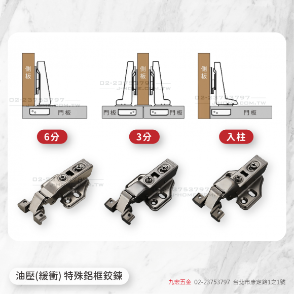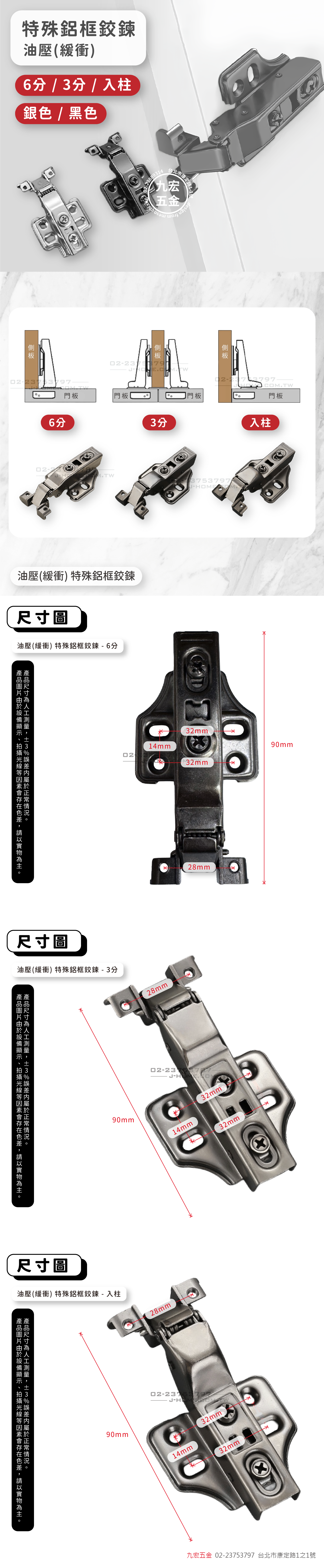 產品介紹 專用於鋁框門板,完美契合不易鬆脫 油壓緩衝功能,安靜關門不震動 適合玻璃鋁框櫃、展示櫃、系統櫃 產品規格 品名 油壓(緩衝) 特殊鋁框鉸鍊 適用鋁框厚度 20 mm 開啟角度 110° 孔距 28 mm 規格 6分、3分、入柱 顏色 銀色 黑色 #鋁框鉸鍊 #油壓鉸鍊 #緩衝鉸鍊 #鋁框專用 #6分鉸鍊 #3分鉸鍊 #入柱鉸鍊 #櫃門五金 #玻璃門鉸鍊 #家具五金 #系統櫃五金 #櫃門安裝 #靜音鉸鍊 #緩衝門鉸鍊 #櫃體五金 #居家收納五金